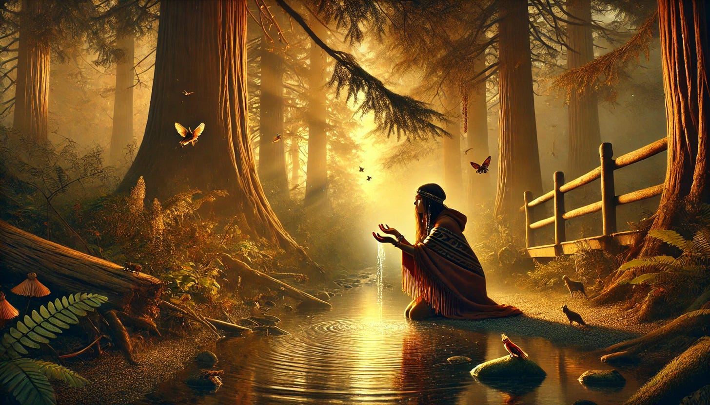 By the time she reached the brook, the sun had lowered enough to lace the water with gold thread. The sound of it—constant, deliberate—met her and unbraided her breath. She knelt. Cold crept through her skirt and kissed her knees. She opened the pouch and took out an offering: sweetgrass braided with cedar tips, a pinch of tobacco, a single bead from her grandmother’s necklace. She placed them one by one into the current. The sweetgrass darkened, released a sweetness like warm hay and lemon; the bead flashed and tumbled into a hollow among stones.